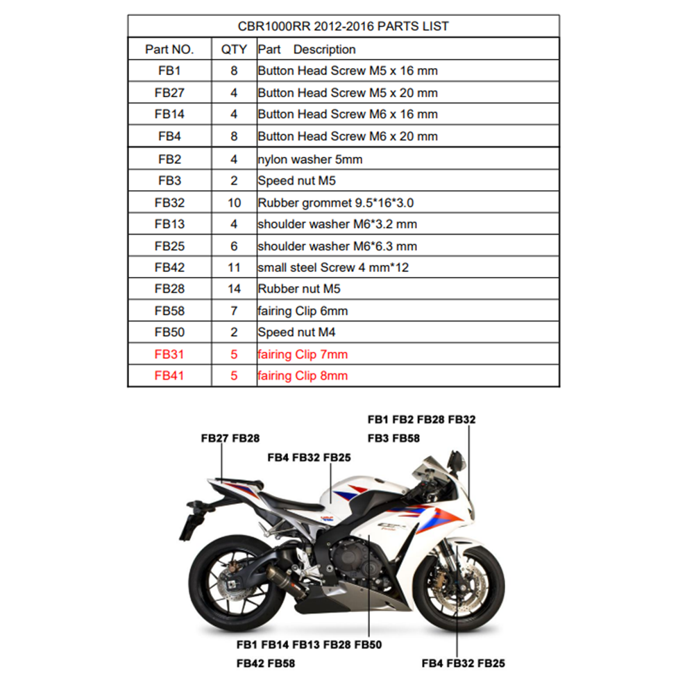 Σετ Βίδες-Κλιπάκια Για Τα Πλαστικά Honda CBR1000RR 2012-2016