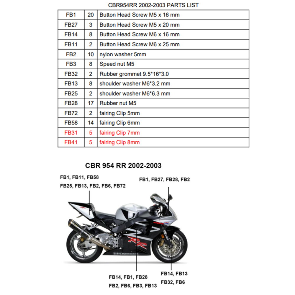 Σετ Βίδες-Κλιπάκια Για Τα Πλαστικά Honda CBR954RR 2002-2003