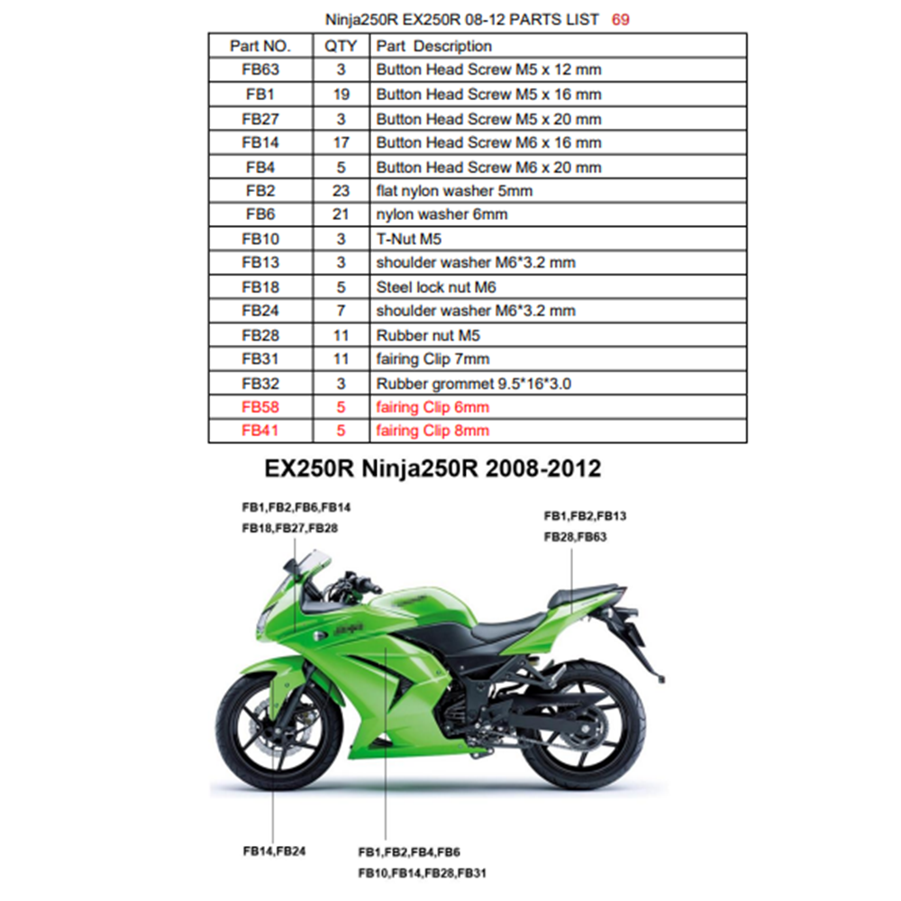 Πλήρες σετ βιδών εξαιρετικής ποιότητας, κατάλληλες για το μοντέλο Kawasaki EX250R NINJA 250 2008-2012 (Περιεχόμενα φωτογραφία 2)