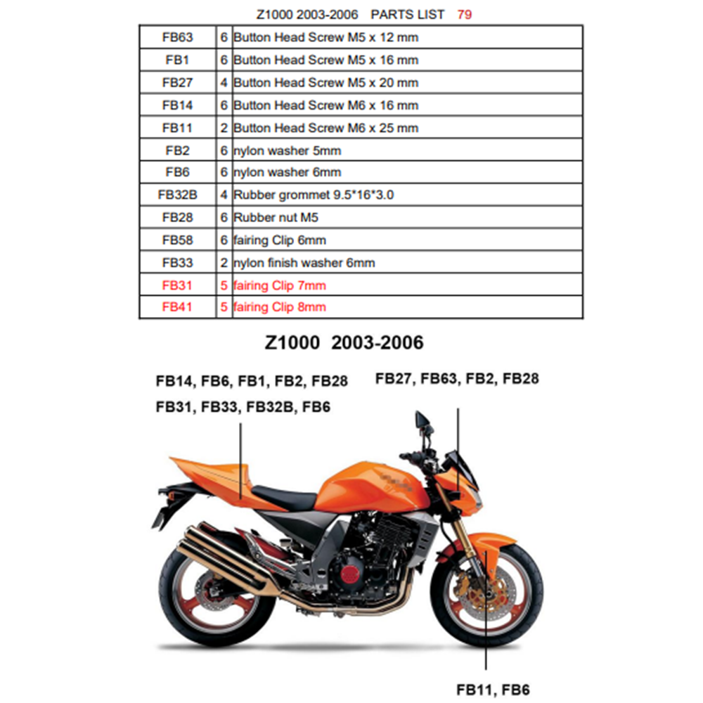 Σετ Βίδες-Κλιπάκια Για Τα Πλαστικά Kawasaki Z1000 2003-2006