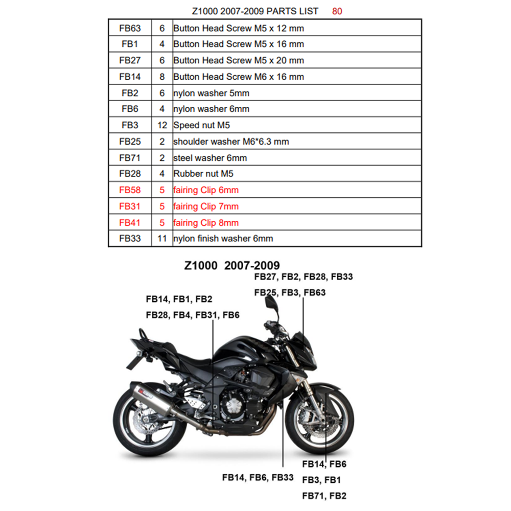 Πλήρες σετ βιδών εξαιρετικής ποιότητας, κατάλληλες για το μοντέλο Kawasaki Z1000 2007-2009 (Περιεχόμενα φωτογραφία 2)