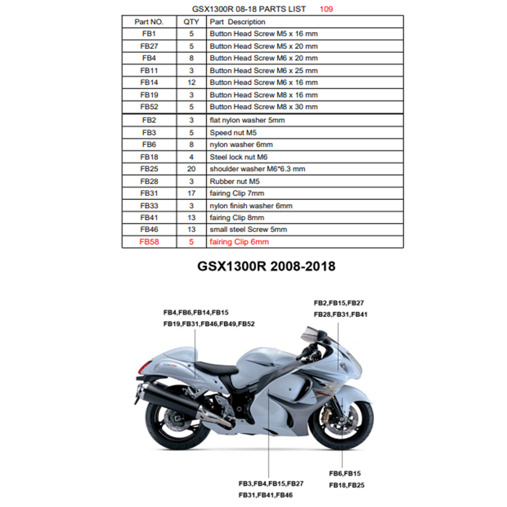 Σετ Βίδες-Κλιπάκια Για Τα Πλαστικά Suzuki GSX-1300R Hayabusa 2008-2020