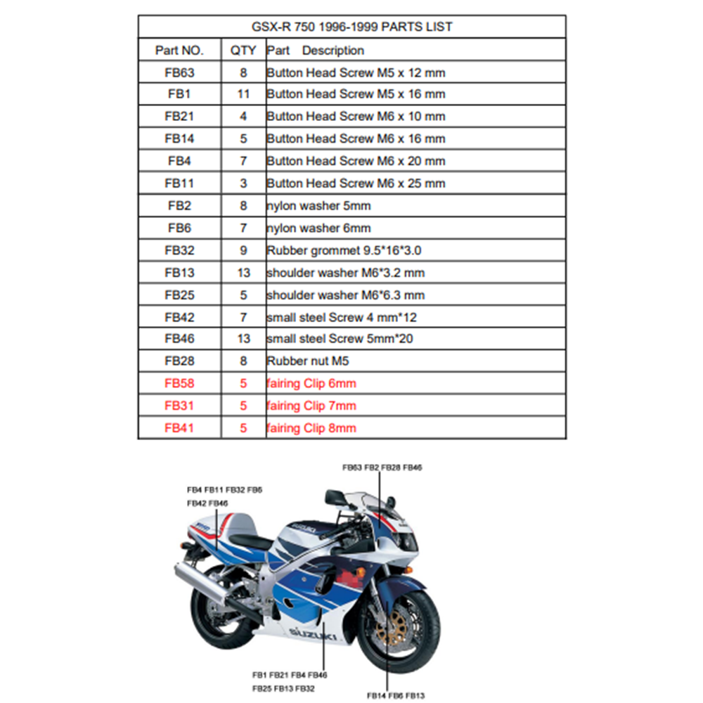 Σετ Βίδες-Κλιπάκια Για Τα Πλαστικά Suzuki GSX-R 750 1996-1999