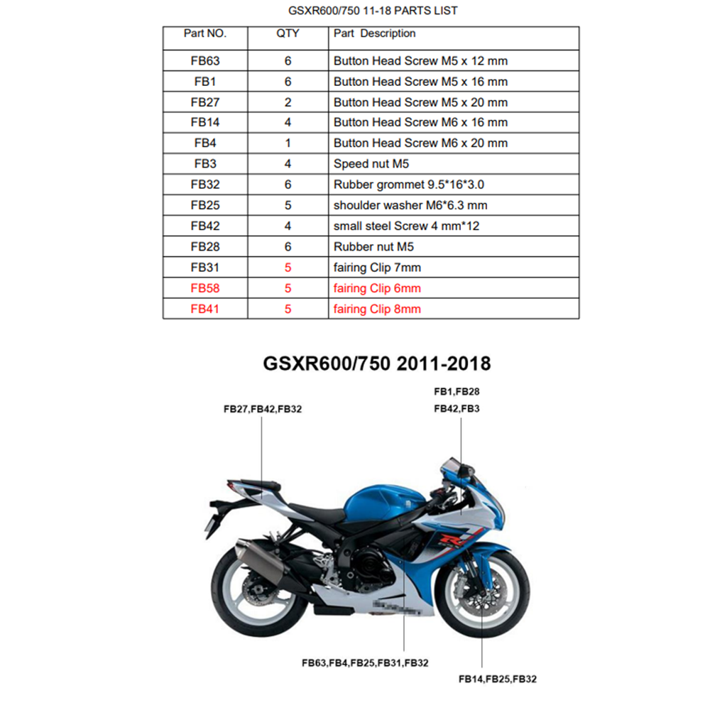 Σετ Βίδες-Κλιπάκια Για Τα Πλαστικά Suzuki GSX-R600 GSX-R750 2011-2018