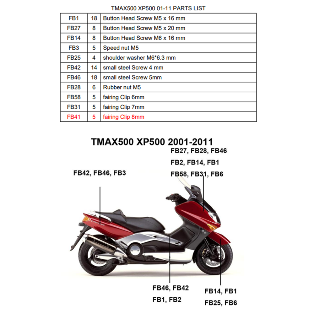 Σετ Βίδες-Κλιπάκια Για Τα Πλαστικά Yamaha Tmax 500 XP500 2001-2011