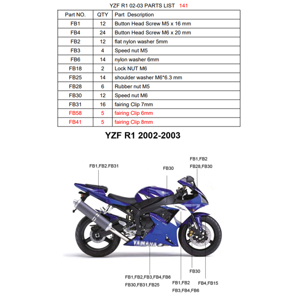 Σετ Βίδες-Κλιπάκια Για Τα Πλαστικά Yamaha YZF-R1 2002-2003