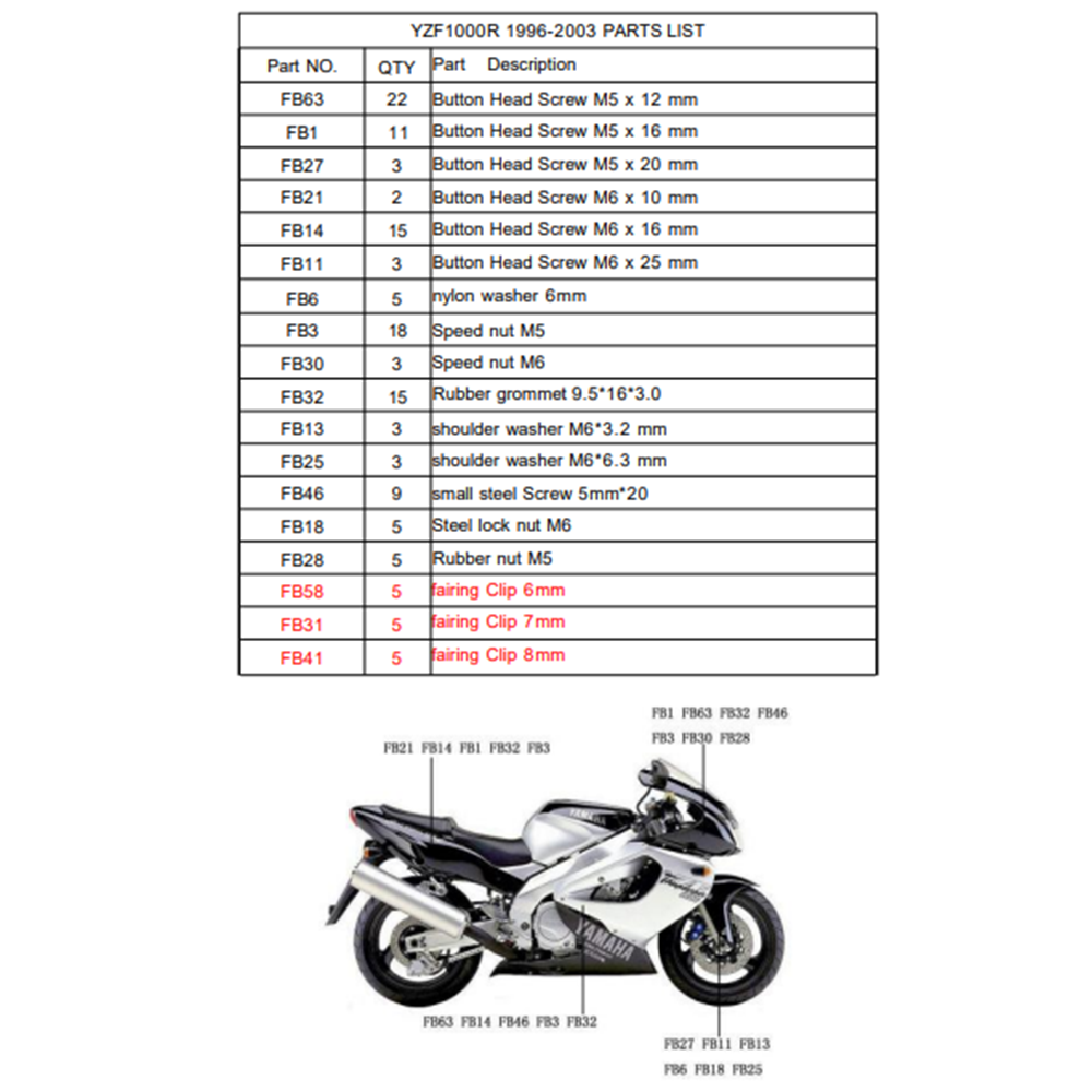 Σετ Βίδες-Κλιπάκια Για Τα Πλαστικά Yamaha YZF1000R 1996-2003